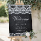 Amaze your guests with this rustic wedding welcome sign featuring beautiful white lace on a chalkboard background.