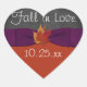 This modern and trendy black and white chalkboard look 1.5" heart shaped "Fall in Love" save the date autumn wedding favour sticker or envelope seal, in fall colors of burnt orange, rust, gold, green and red has images of three dried maple leaves and a dark purple PRINTED ribbon with a bow on it that matches the wedding invitation shown below. It would be perfect for a relaxed fall or country wedding, or an informal or casual wedding. Use it to seal your invitations with or attach to your wedding favors or place at your candy buffet table. You can also change the shape and size. ****BE CAREFUL if you do change the shape of the sticker yourself, as some of the design and text may get cut off. To avoid a mis-print, please email me to request another shape. If you need any other matching items, or assistance customizing this sticker, please email niteowlstudio@gmail.com.