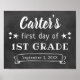 Celebrate the start of a new chapter with this chalkboard-style First Day of 1st Grade sign. The design pairs playful script with bold serif lettering, whimsical star accents, and a hand-drawn ribbon banner for the date. A perfect photo prop for capturing back-to-school memories. Personalize with your child's name, grade, and date.