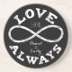 Celebrate the infinite love between your favorite bride and groom with this custom coaster! A white chalk infinity symbol and “Love Always” text surrounds a couple's names and wedding date on a black chalkboard background. Makes a beautiful, modern, personalized gift.