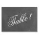 A wedding table number place card featuring angled script over a chalk inspired background.