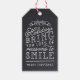 Custom printed holiday gift tags personalized with your photos and text. This fun two-sided design features cute hand-lettered style typography on a faux chalkboard background and green striped washi tape around your photo. The text reads "Hope the holidays bring you lots of reasons to smile". Personalize it with your photo, family name or other custom text. Use the design tools to edit the text fonts and colors, add more photos and create a unique one of a kind holiday gift tag.