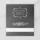 Chalkboard gray folded place card with white graphics of a rose, on the front and a decorative framed area, on the back. A white band, across the front of the card is ready for you to hand write each guests name. The back of the card has custom white text ready for you to change to read what you want.