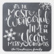 Beautiful typography based holiday sticker. "It's the most wonderful time of the year" appears in white hand-lettered typography on a charcoal gray chalkboard background accented with white snowflakes.