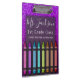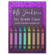Purple faux glitter sparkles behind an array of colorful crayons laid out in a rainbow pattern. Easily update the name, class description, and school name on front and back. Chalkboard script and fonts are used to mimic a teacher's classroom. Available in many other sparkly colors.