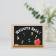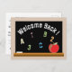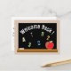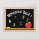 A simple but straight to the point postcard to welcome your students back-to-school . On the front , it has the illustration of a faux chalkboard . On it , it says "Welcome Back!" (You can change this greeting if you wish to.) It also has the letters A , B , C and the numbers 1 , 2 .3 written in light color chalks . It also has a red apple in the lower right corner . On the back , you can personalize it with your own text (date and time the school will start ) , there is also space to add the teacher's name and signature ,as well as the room number .