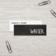 Slim business card with writer in a handwritten font on a chalkboard background. Write your name and contact info on the back.