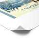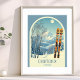 Poster from a wonderful ski resort holiday in the beautiful mountains of Chamonix France. This small poster features an arch with a stunning blue-grey mountain landscape and retro ski boards in an orange tribal pattern in the foreground. The rest is in a lovely light blue tone with the location lettering in a modern font. The design is a lovely combination of retro and modern, and I hope you enjoy it!