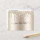 Our champagne dripping glitter trendy glam wedding save the date post card. Add the brides name, the grooms name and the date and place. See our Champagne Dripping glitter collection for matching products.