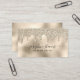 The front of this business card for makeup artists features a luxurious champagne-colored metallic foil background bordered with glam champagne glitter drips. Your name on front of the card is in elegant script typography with flourishes at both ends of your name (don't remove the boxes on the name portion of the template). It is very easy to replace all text using the personalization template.