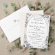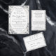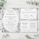 Design front features a champagne-pink background surrounded by the image of white lace. A white oval bordered in a silver-colored frame displays heading, names of couple, church and wedding date.