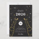 Pop the bubbly! Festive New Year's Eve party invitations feature a two champagne bottle illustrations on a black background adorned with gold and white stars.