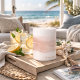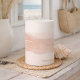 Beach-inspired neutral accent in soft taupe with abstract champagne wave art along the base. The flowing watercolor wrap adds depth against ivory wax, pairing beautifully with light wood trays, woven textures, and coastal console styling. Ideal for coffee tables, entryway displays, or layered shelf arrangements.