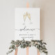 Festive and elegant welcome sign for your engagement party or wedding features a pair of clinking champagne glasses in watercolor, filled with classic golden bubbly. Personalize with three lines of custom text beneath; shown with "welcome" and the couple's names and event type.
