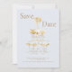 Photo save the date. Champagne Tower. Icy Blue background. Elegant. Wedding Website. Gold text.