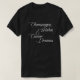 My 11 yo wore adult XL (5’7” 165#). The 8yo is small framed. She wore adult small and tied it in the back. Grandma wore adult large with long sleeve shirt underneath. Tall girl adult medium. Dark haired male adult large. Good quality dark Heather gray, Gildan brand shirt. -it was next up from basic choice and cost about $20 per shirt. Not too thick or thin. Washed and dried well, no major shrinkage. Not see-through. Can wear a bra under it fine. Screen print is just as shown and well done, front and back.