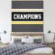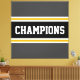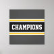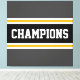 This colorful, sporty design features athletic CHAMPIONS text inside a wide black horizontal center stripe with adjoining golden yellow orange and white racing stripes against dark gray outer edge stripes. The colors and text in this design can be personalized.