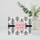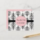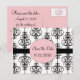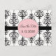 Chandelier Pink Save the Date Wedding Cards - black and white chandelier wedding theme on front with a thick black line through the center. Over top the thick line is a dotted line circle that's shade in baby pink. The back of each save the date card features a pink background. You can change the font type, sizing, color or even rearrange text boxes to your personal tastes by clicking the orange customize button below the wedding save the date card demo above. If you are satisfied with the text style, color and sizing, you may use the personalize feature to the right of the demo to personalize the wording to your wedding details. Do you love the design? Be sure to scroll down to find matching RSVP cards, wedding invitations, and much more.