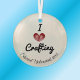 Edit this elegant glass ornament and replace "Crafting" with any other word. The red heart is a paper quilled print. A thoughtful keepsake to be displayed year-round. Easily change name and text using the Template provided. Ideal gift for a special person who enjoys hobbies and crafts! Diameter of 3", is .16" thick, the back is frosted and it weighs 2.4-ounces. See "About" for more information.