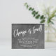 Keep your friends and family up to date with your new address using these simple, elegant announcement cards. Whether you're a newlywed or just want a unique design for letting your tribe know how to find you, this card is versatile enough for anyone. It features pretty typography graphics that read "Change is Good!" on the front and "Stay in Touch!" on the back, using a modern, casual, handwritten script font. Use the template fields to add all your own details to personalize this design for your own use. The white type was placed over a gray vintage textured grunge background. If you'd rather replace this with a different background image, that's also possible! // 105 //