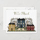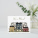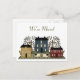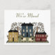 Colorful country primitive artwork of houses, trees, and sheep. We've moved in muted green text at the top of the post card. Customize all the text front and back to suit your needs.