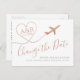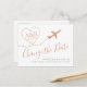 Copper faux foil metallic effect travel theme "Change the Date" postcard with a cute poem and airplane monogram with initials on a minimalist and simple design. Announce that your destination wedding location or date (or both) has to be rescheduled, postponed, or changed in modern calligraphy script fonts and a combination of different typography. Visit the Paper Grape Destinations Zazzle Designer Shop for more travel and beach theme wedding invitation, save the dates, and postponement announcements.