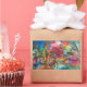 Original Graphic Design by Alessandro Lumini Colorful and expressive watercolor painting 1988 .Knights jousting on horseback in bright blue green,pink,fuchsia,purple,orange yellow,white, brown colors.