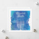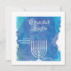 A contemporary design with a blue, watercolor background and classic font that spells out "Chanukah Lights" over a white menorah. Vecteezy Jewish Candlesticks.