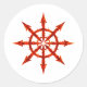 The Chaos star is a spoked device with eight equidistant arrows radiating from a central point. It was originally devised by the fantasy novelist Michael Moorcock as a symbol of chaos (infinite possibility). The Chaos wheel has been adopted as a symbol of Chaos magick. The current rounded shape was devised by author and chaos magician Peter Carroll.