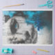 The digital artwork is a compelling fusion of chaos and artistry, featuring a grayscale human face partially obscured by black paint drips. The eye of the face, detailed with a bright blue iris, draws the viewer into the chaos. To the left, barren trees overlay the face, adding a haunting touch, while on the right, a vibrant splash of blue, reminiscent of paint or water, contrasts with the silhouettes of trees. The rocky terrain at the bottom anchors the composition, completing the chaotic yet harmonious scene.