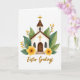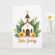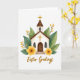 This card shows a small white chapel centered on a bright white background, painted in a soft, watercolor-like style. The chapel has a warm brown gabled roof, a slim steeple, and two small golden crosses that catch the eye. A wooden front door and a pair of arched windows give it a welcoming look, like a place where friends might linger together after a spring gathering. Around the building, curling green leaves drape in a loose frame, with yellow flowers and tiny golden buds tucked in like little gifts 🌷. The greenery leans inward from both sides, creating a gentle, close-knit feeling in the way it surrounds the chapel. The words “Easter Greetings” sit beneath the illustration in a golden-brown color, centered and written in flowing lettering 🐇. Yellow blossoms dot the foliage near the lower corners, with a few sprigs reaching up toward the roofline.