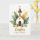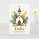 Designed with a calm spring scene, this card centers on a small chapel with white walls and a warm brown cone-shaped roof topped by a tiny golden cross. A second cross sits on the front above a wooden door, giving the building a quiet, welcoming look, like a gentle nod between close friends. Around it, oversized leaves in emerald and soft sage curl inward as if they’re leaning in together, dotted with budding stems and creamy white blossoms that feel fresh and tender 🌷. The background stays mostly white, letting the earthy roof and green foliage stand out while soft, diffused watercolor shading keeps everything light and airy. Small round dots in golden ochre and muted teal are scattered across the open space like confetti, adding a soft festive touch 🐰. The words “Easter Greetings” appear near the lower portion in flowing gold lettering, easy to spot without overpowering the artwork. Fine lines define the wooden door panels, and the blossoms have pale centers with gentle yellow highlights.