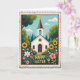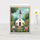 This card shows a small rural chapel centered in a lush green landscape, framed by a perforated edge that looks like an old postage stamp. The cream-colored building has a tall steeple topped with a small golden cross, arched windows, and a wooden door that feels ready to welcome two close friends arriving side by side. Around it, sunflowers with dark centers mix with white blossoms and bright red flowers, tucked into leafy bushes and tall trees, with a few 🌷 touches that add a gentle, affectionate mood. Above, a clear blue sky holds a handful of soft clouds, like a calm backdrop for a shared springtime moment. Along the bottom, a seasonal greeting sits in large warm yellow letters, centered beneath the scene. The greens, blues, and flower colors are rich and sunny, and the careful petal-and-leaf details make the garden look full and inviting. The perforated frame is a pale cream border with evenly spaced cutouts all the way around, and a small 🐇 detail can be tucked near the lower flowers.