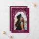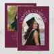 Modern and whimsical graduation announcement photo card featuring an arched frame photo on the front and 1 on the back. The text says "Chapter Complete" with hand drawn stars. Add the graduate's name, information, and message to personalize this card. Cranberry background.