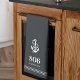 A simple and elegant custom kitchen towel featuring your home's house number and street name in white lettering beneath a nautical rope and anchor illustration. Makes a great realtor closing gift, housewarming gift, or a unique finishing touch for your vacation rental home or beach house.