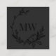 Monogrammed square business card with your initials inside a hand drawn wreath with a flower and greenery in black against dark gray.