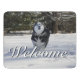 Customizable welcome door sign featuring Miya, a full blooded female Siberian Husky runs through the snow. Siberian Huskies are medium sized dogs that belong to the Spitz family.