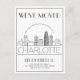 A unique modern deco-style moving announcement postcard for the beautiful city of Charlotte, North Carolina. This card features a stylized illustration of the city's unique skyline with its name underneath. This is followed by your address information in a matching open-lined style. All individual elements of the card are unlocked so feel free to change or add any details necessary by using the customization function.