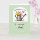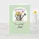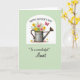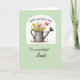 This card features a vintage-style metal watering can brimming with garden flowers, set like a sweet gift between close family ❤️. The can shows light specks of rust and soft shading, giving it a gently worn look that pairs nicely with the fresh blooms. A curved white arch frames the illustration, standing out against a pastel green background that feels calm and welcoming. The bouquet spills upward in sunny yellows and soft pinks with thin green stems, like a freshly gathered bunch meant for someone cherished. In the upper right, a small red butterfly hovers with a light, fluttering motion, adding a touch of lively romance to the quiet scene 🌼. At the top, “Happy Mother’s Day” appears in a flowing, cursive-style line in dark lettering, while “To a wonderful Aunt” sits below the picture in a matching, elegant cursive-style line. Near the bottom, tiny scattered blossoms and a few fallen petals rest around the base of the watering can. The arched white frame surrounds the central watering can and flowers on the pastel green field, with the red butterfly positioned near the upper right corner.