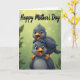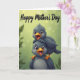 This card shows two cute cartoon birds filling the lower two-thirds of the front, drawn in soft slate gray and gentle blue with bright orange beaks and feet. One smaller bird sits on top of the other’s head, and their wide dark eyes and open smiles create a friendly, affectionate moment that feels like a shared joke ❤️. Fine feather details give them a cozy, cuddly look, as if they’ve just nuzzled together before posing. Behind them, the background fades through layered greens like a leafy garden, with hazy circular light spots floating around to soften the scene. A few simple green leaves peek in from the edges, framing the pair without crowding them. Near the top, a short message is set in thin flowing lettering, colored in a darker green that stands out against the lighter background 🌼. The green backdrop shifts from deeper tones near the edges to a lighter glow behind the birds, with the soft bokeh-like circles scattered around them.