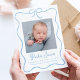 Welcome your baby boy with this charming letterpress birth announcement featuring his square photo framed by a sweet hand-drawn sky blue bow and ribbon border. His name is highlighted in a whimsical sky blue script, with birth details and family names displayed below in classic typography. Printed on premium letterpress paper, this soft and elegant design offers a heartwarming way to introduce your little one to loved ones. Perfect for celebrating the arrival of a newborn baby boy.