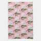 This lovely Charming Camellia Floral kitchen towel features a beautiful Victorian botanical graphics of a white and pink Countess of Orkney camellias with green leaves on a pink background.