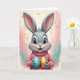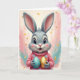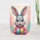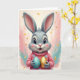 This card shows a light gray bunny centered on the front, with long upright ears tinted rose inside and a tender, friendly gaze that feels like it’s meant just for someone special 🐰. Its large eyes have deep black pupils with a small turquoise glint, and its open smile is warmed by rosy cheeks and a soft pink nose. The bunny wears a salmon-pink ribbed sweater dotted with tiny sky-blue flowers, adding a cozy look that suggests a sweet bond. In its paws, it carefully holds two oversized decorative eggs as if offering a shared treat—one shiny gold and the other turquoise with scattered gold speckles 🐇. Behind the bunny, loose brushy color washes blend blush pink and calm teal into a soft halo that keeps the focus on the gentle expression. Any greeting text sits near the top in a simple teal tone, with a smaller line near the bottom in warm gold to echo the eggs. Fine gold flecks drift across the background, catching the light around the bunny’s ears and the glossy egg surfaces.
