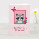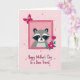 Designed with a soft pastel pink background, this card features a friendly woodland creature centered inside a rosy frame edged with tiny dashed lines. The little animal has light gray fur, a dark mask around its eyes, and perky ears, and its small curved smile feels like it’s sharing a quiet, affectionate moment with the viewer ❤️. Small fuchsia starburst shapes are scattered across the background, adding a light, celebratory sparkle around the scene. Near the upper left of the frame, a fuchsia butterfly hovers with open wings, as if it has drifted in to witness the sweet exchange. From the lower right corner, a cluster of deep fuchsia and crimson flowers spills upward with slender teal leaves, bringing a gentle, friendship-tinged closeness to the layout 🌼. Beneath the illustration, a short message sits centered in deep magenta lettering, standing out clearly against the pale pink space. The frame is pink with a stitched-look dashed outline, and the flowers show layered petals in rich red-pink tones beside narrow teal leaves.
