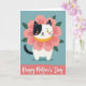 This card features a simple, stylized cat-like creature standing upright, mostly white with charcoal markings on one ear, a face patch, and the curled tail tip. Its face has bright eyes—one golden and one a dark dot—with fine whiskers and soft rosy cheeks that give it a gentle, affectionate look ❤️. A large, soft pink flower with many petals frames the character, as if it’s nestled inside the bloom like a cozy hug. Deep green leaves peek out behind the petals, adding a natural backdrop, and a cheerful golden band circles the creature’s neck like a small celebration. The background is a muted aqua tone with a light speckled texture that makes the colors feel soft and warm. Along the bottom, a wide coral-pink strip holds white lettering centered across it, standing out clearly against the darker band 🌼. The coral band sits beneath the flower and figure, with the white text running horizontally across the middle of that strip.