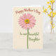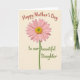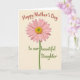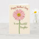 The front design shows a single daisy-like flower centered on a creamy background, with soft pink petals spreading outward like a gentle embrace ❤️. Its round center glows in golden yellow with tiny textured details that shift toward a small green spot at the very middle, adding a quiet, caring focus. A slim deep-green stem drops straight down, keeping the layout calm and balanced. Near the top, “Happy Mother’s Day” appears in warm crimson lettering that arches slightly above the bloom. Near the bottom, “to our beautiful Daughter” is set in a moss-green line, placed neatly beneath the stem so the message feels close and connected 🌼. The soft lighting and smooth color transitions give the flower a tender, affectionate look, like a thoughtful pause between loved ones. The petals show subtle shading from deeper pink near the base to lighter pink at the tips, and the text sits centered above and below the flower on the pale backdrop.
