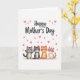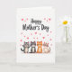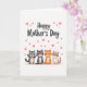 This greeting card features a white background with “Happy Mother’s Day” placed across the upper area in dark lettering, standing out clearly against the light space. Small pink hearts drift downward like confetti, adding a sweet, affectionate touch ❤️. Along the bottom, four cartoon-style cats stand side by side, their wide eyes and gentle smiles suggesting a friendly closeness, like they’re sharing a quiet moment together. Two cats are soft gray with darker stripes, one is warm orange with tabby markings, and one is cream with light brown stripes while wearing round red glasses. Their simple shapes and softly shaded coloring keep the scene light and tender, with the cats’ relaxed posture hinting at comfort and care. The text stays above the characters, leaving airy space between the words and the row of cats so the hearts can float through the middle. Pink heart shapes are scattered across the top and center, with the four cats lined neatly along the lower edge 🌼.