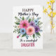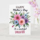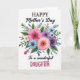 This card features a full, watercolor-style bouquet centered on a bright white background, with fuchsia and coral flowers mixed with sky-blue and deep lavender blooms for a romantic, friendly feel ❤️. Each blossom has a dark, rich center that draws the eye inward, like a gentle gathering of faces leaning close. Deep green leaves and lighter airy sprigs surround the flowers, framing the arrangement with a soft, garden-fresh look 🌼. At the top, the text reads “HAPPY Mother’s Day,” with “HAPPY” and “Day” in tall serif capitals and “Mother’s” in a flowing, cursive-like style, all in a dark tone that stands out clearly. Below the bouquet, “To a wonderful” appears in the same flowing style, placed neatly as a lead-in line. The word “DAUGHTER” sits underneath in larger, berry-colored, simple lettering that feels direct and affectionate. The overall layout keeps the flowers as the centerpiece, with the text stacked above and below for balance. The bouquet includes crisp white highlights on petals and leaves, and the foliage spreads outward in rounded clusters around the central blooms.