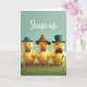 This design shows three plump, animated yellow birds standing shoulder to shoulder, their rounded shapes and close spacing suggesting easy friendship and a shared little joke 🐇. The middle bird wears a brown fedora with a purple bow tie, and it leans forward slightly as if politely speaking for the group. On the left, a bird in a blue bowler hat and matching blue bow tie turns its wide eyes toward the center with a tender, supportive look. On the right, the third bird wears a green top hat with a black bow tie, its small upturned beak angled like a gentle smile toward the others 🌷. Behind them, the background fades from soft aqua-green at the top into a grassy green ground, giving the scene a calm, outdoor feel. Near the top, the words “Scuse us.” appear in flowing, dark lettering centered above their heads. Their bright orange webbed feet rest on finely textured green grass, with a soft sheen catching on the hats.