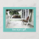 Charming budget-friendly housewarming invite postcard feature stylized photo of an inviting front porch with rocker and swing, with customizable text. Available in print and instant digital download formats,